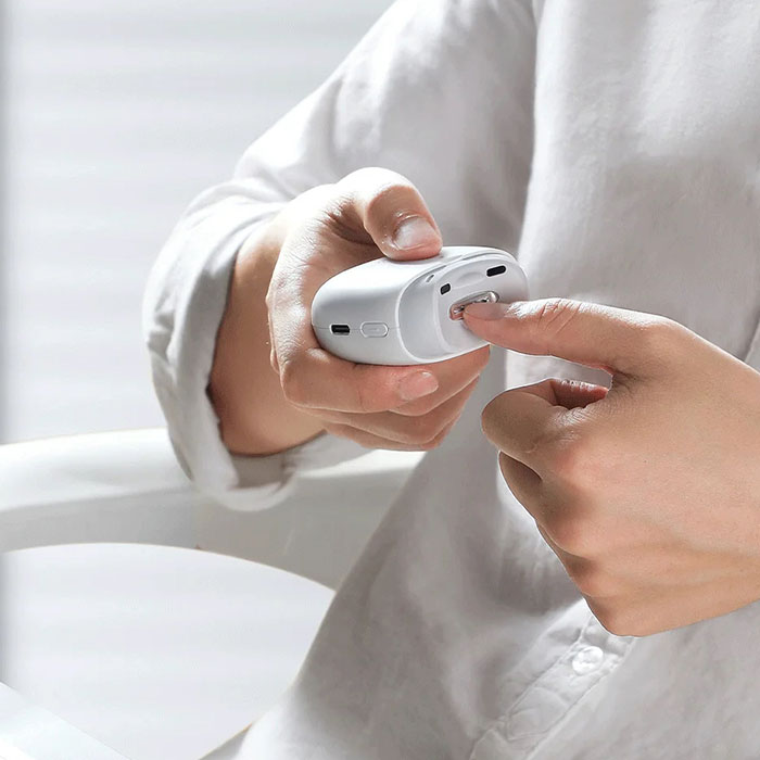 Pripomoček napolnite preko priloženega USB kabla (tip USB-C). Priporočamo polnjenje 3 ure. Polnjenje zadošča za 30-kratno uporabo. Noht približajte ščipalcu in pritisnite na gumb.